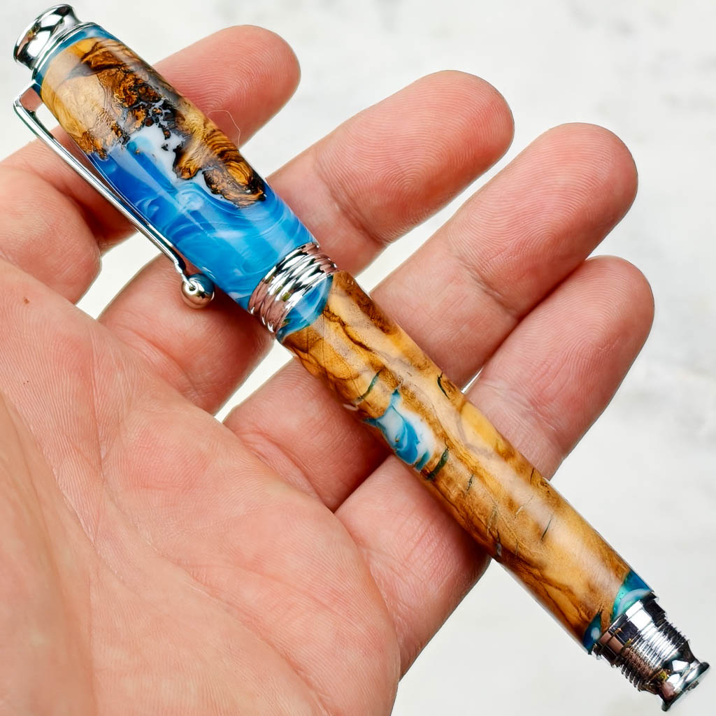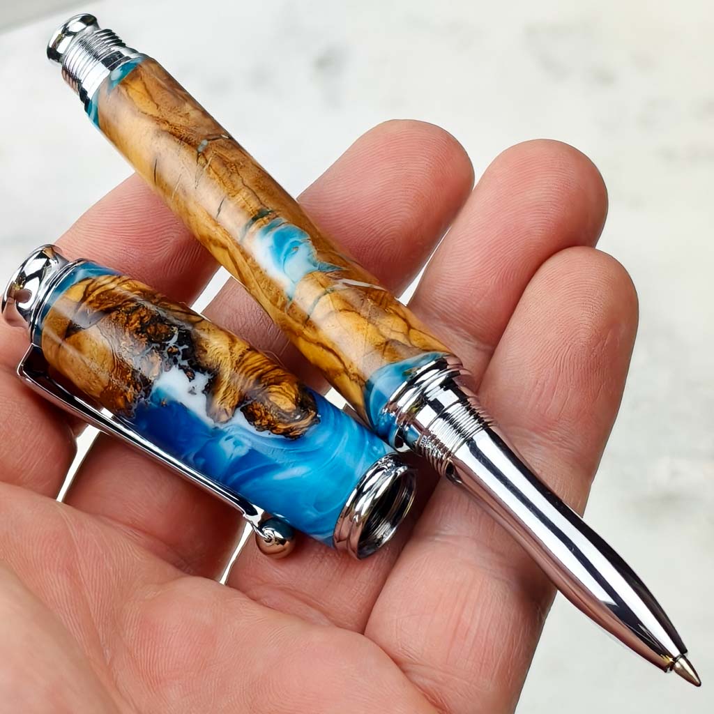 Dřevěné pero z olivy a epoxidu. Vhodné pro lidi, kteří upřednostňují moderní styl v kombinaci epoxid a dřevo
