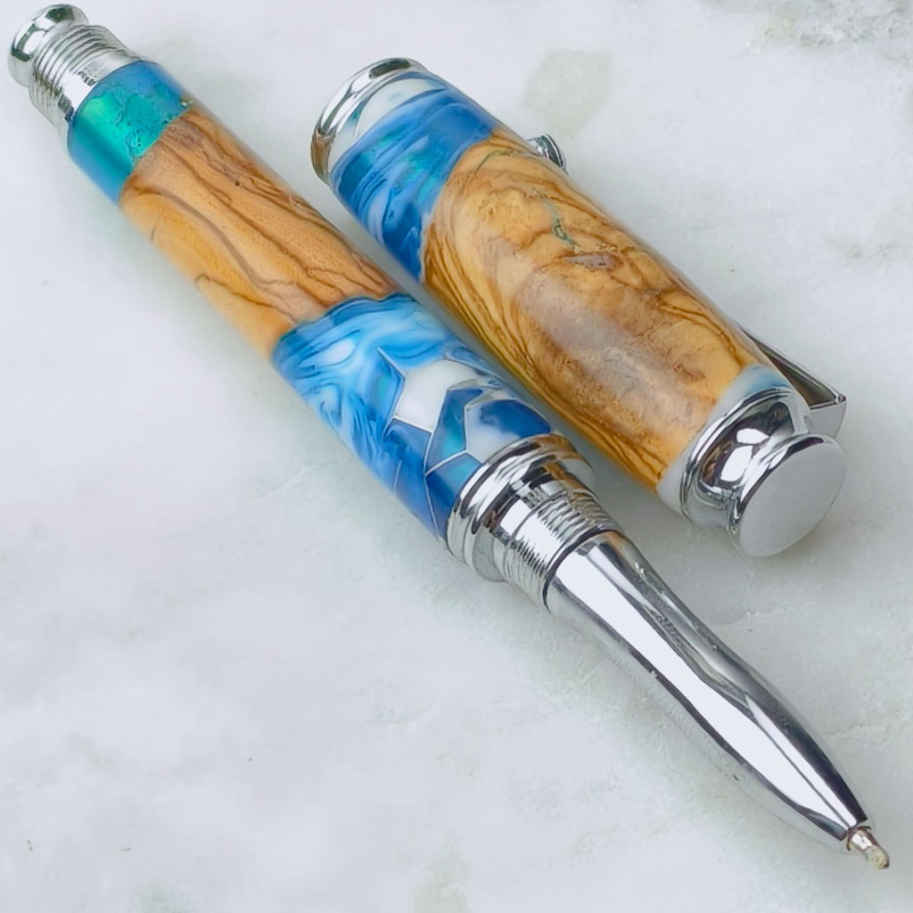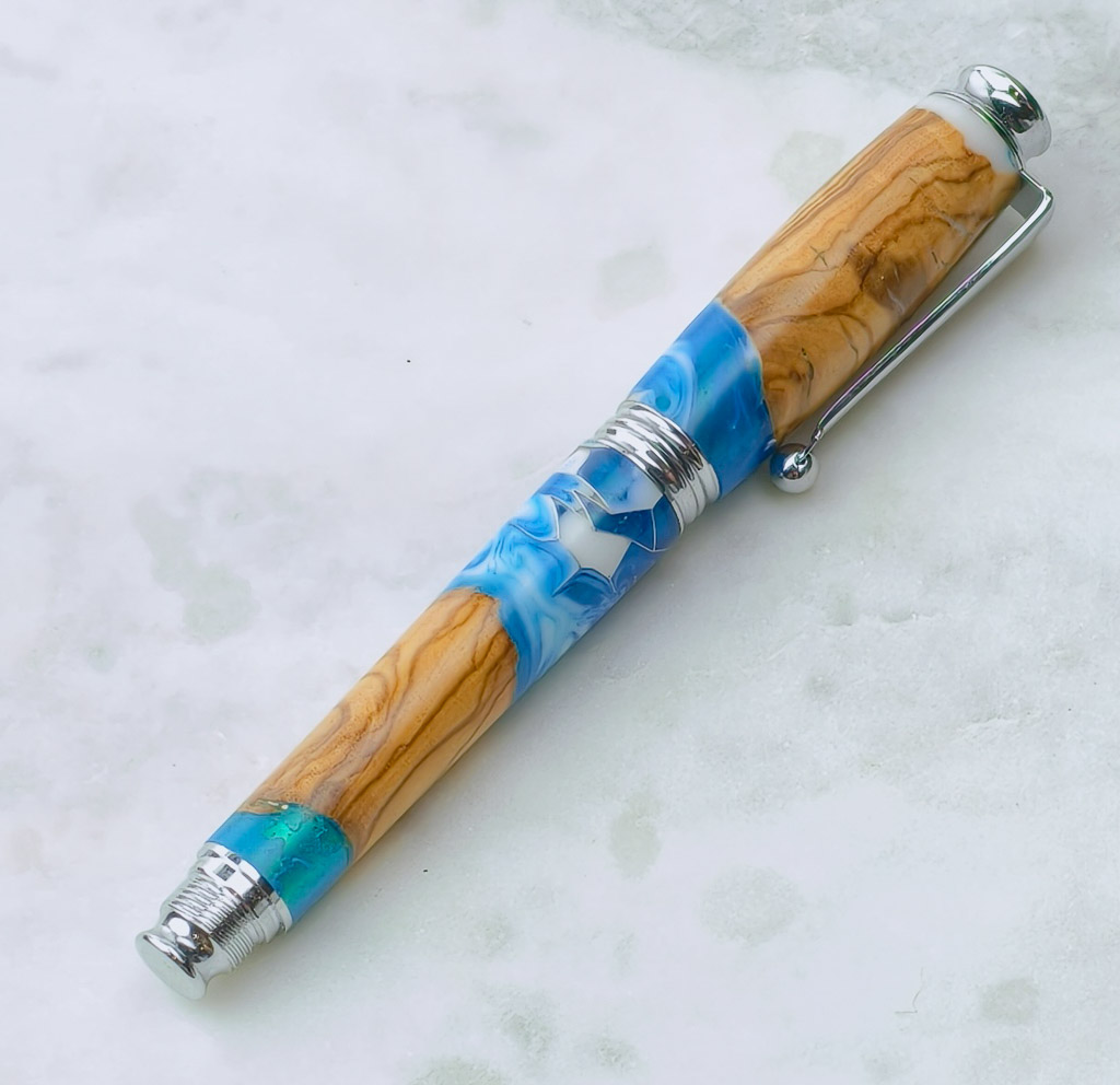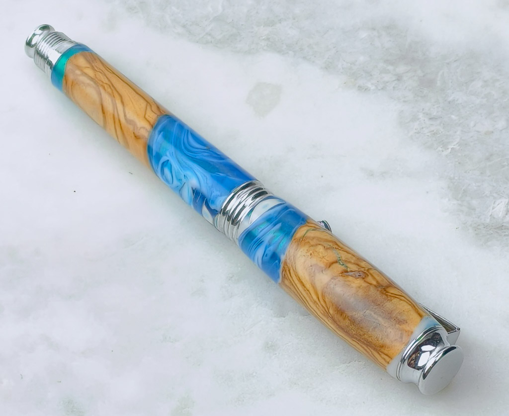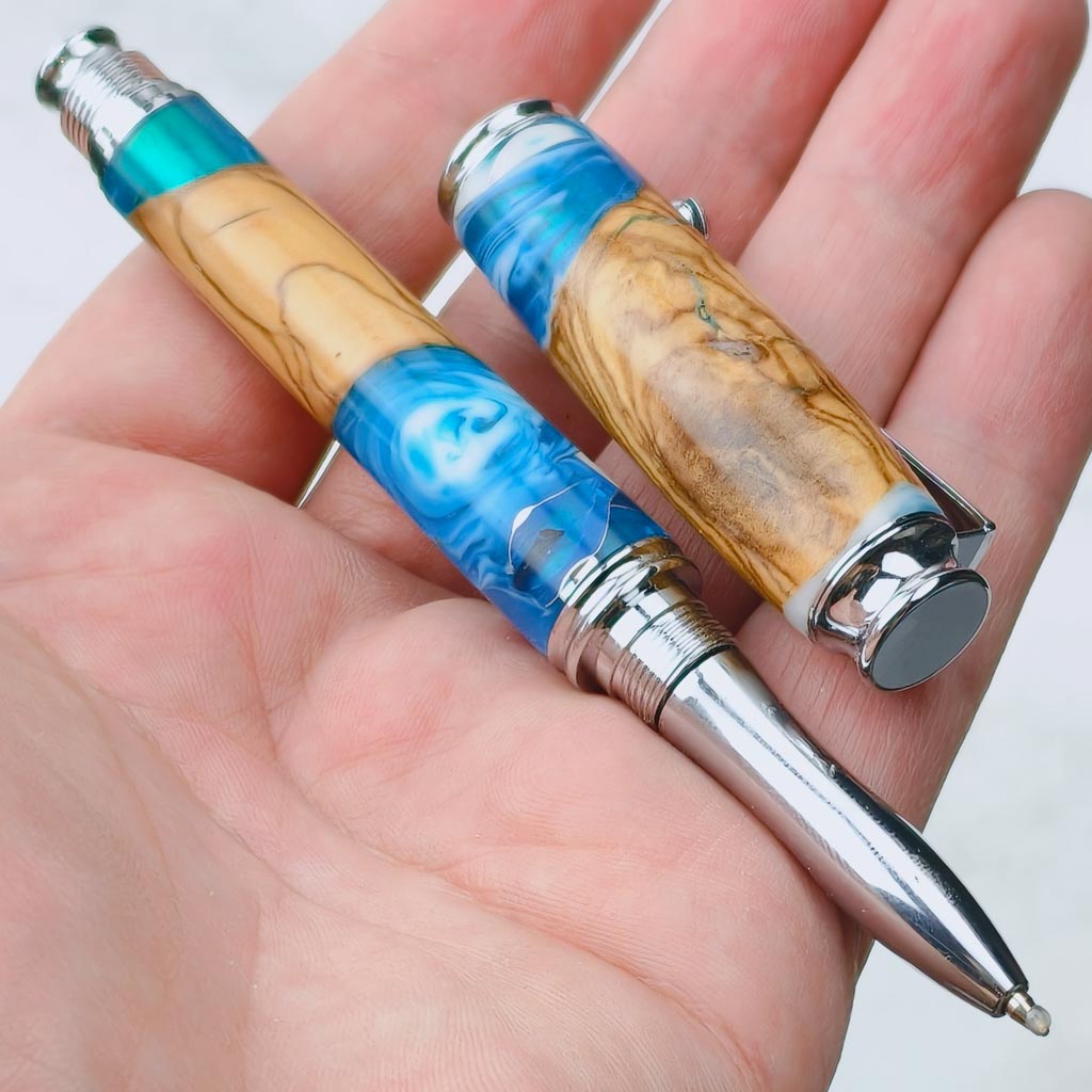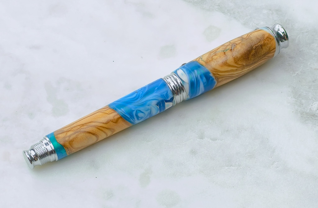 Dřevěné pero z olivy a epoxidu. Vhodné pro lidi, kteří upřednostňují moderní styl v kombinaci epoxid a dřevo