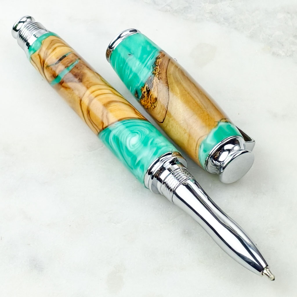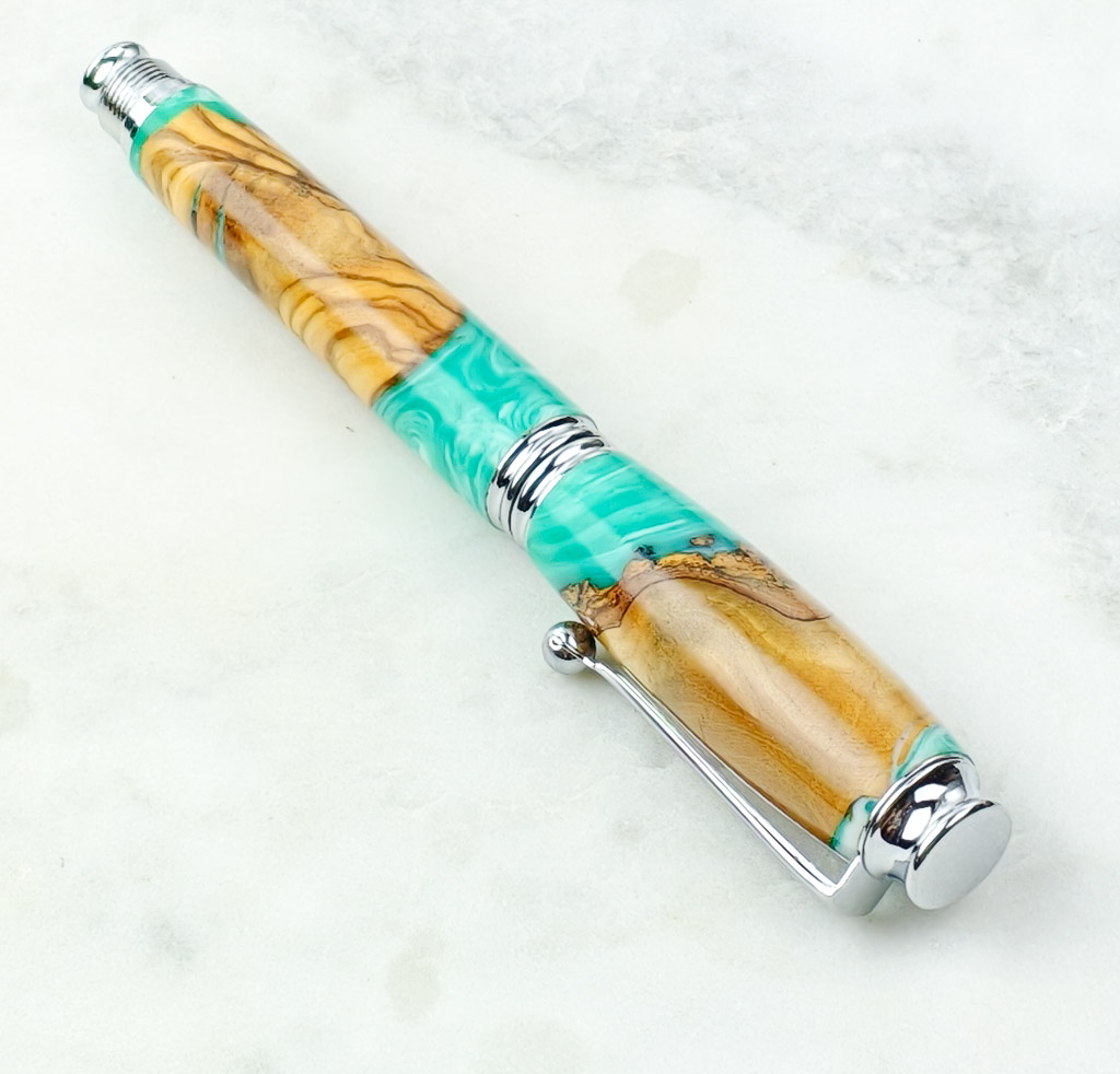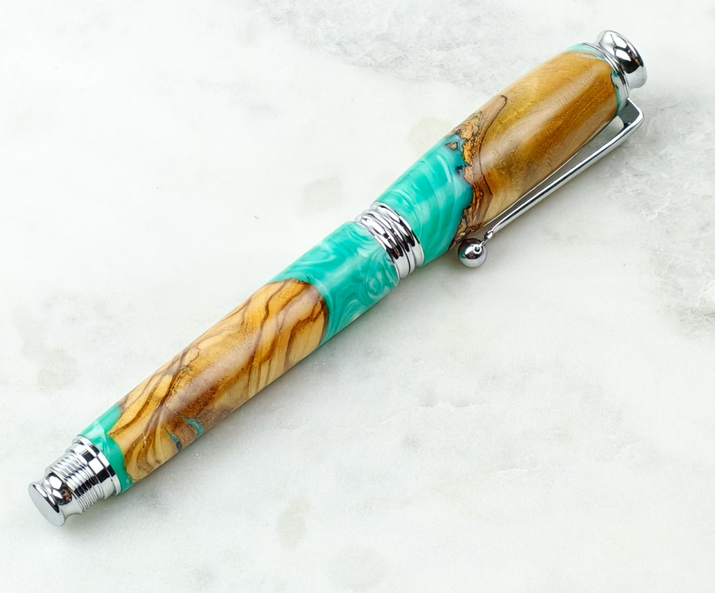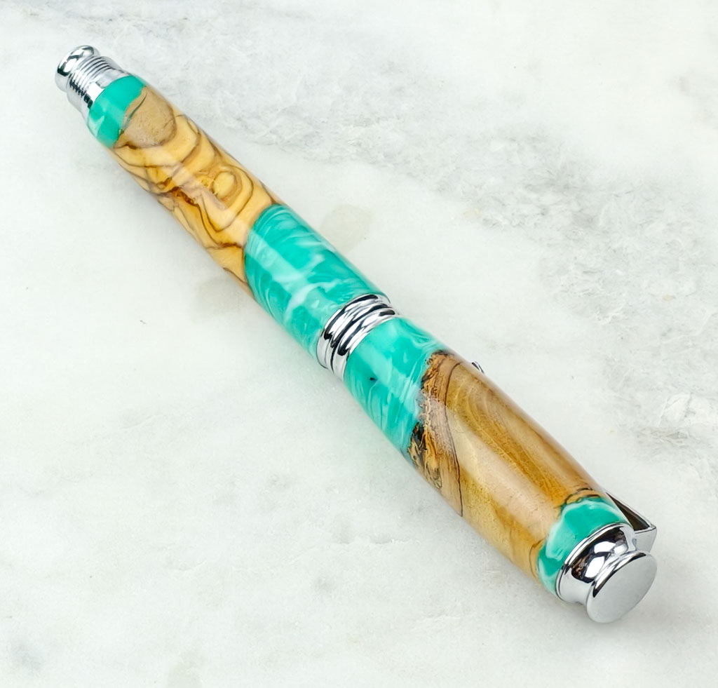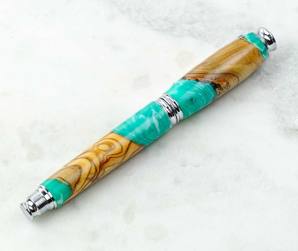Dřevěné pero kuličkové z olivy v kombinaci s pryskyřicí. Nádherná kresba.Na pero lze vypálit dle libosti iniciály, jména, důležité data. Ke každému peru z olivy obdržíte certifikát. Pero, které vidíte skutečně kupujete. Oboustranně prokreslené pero.
